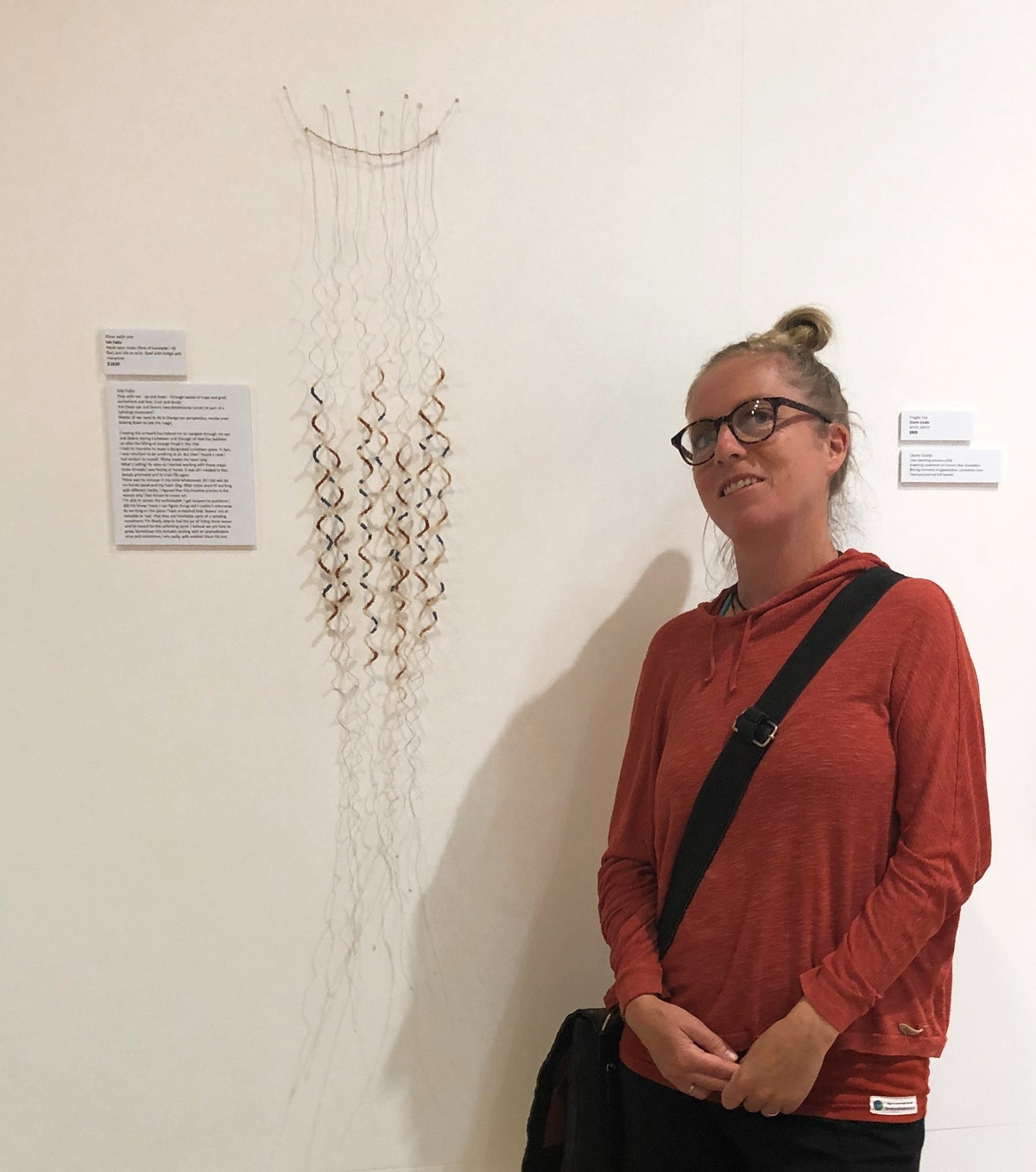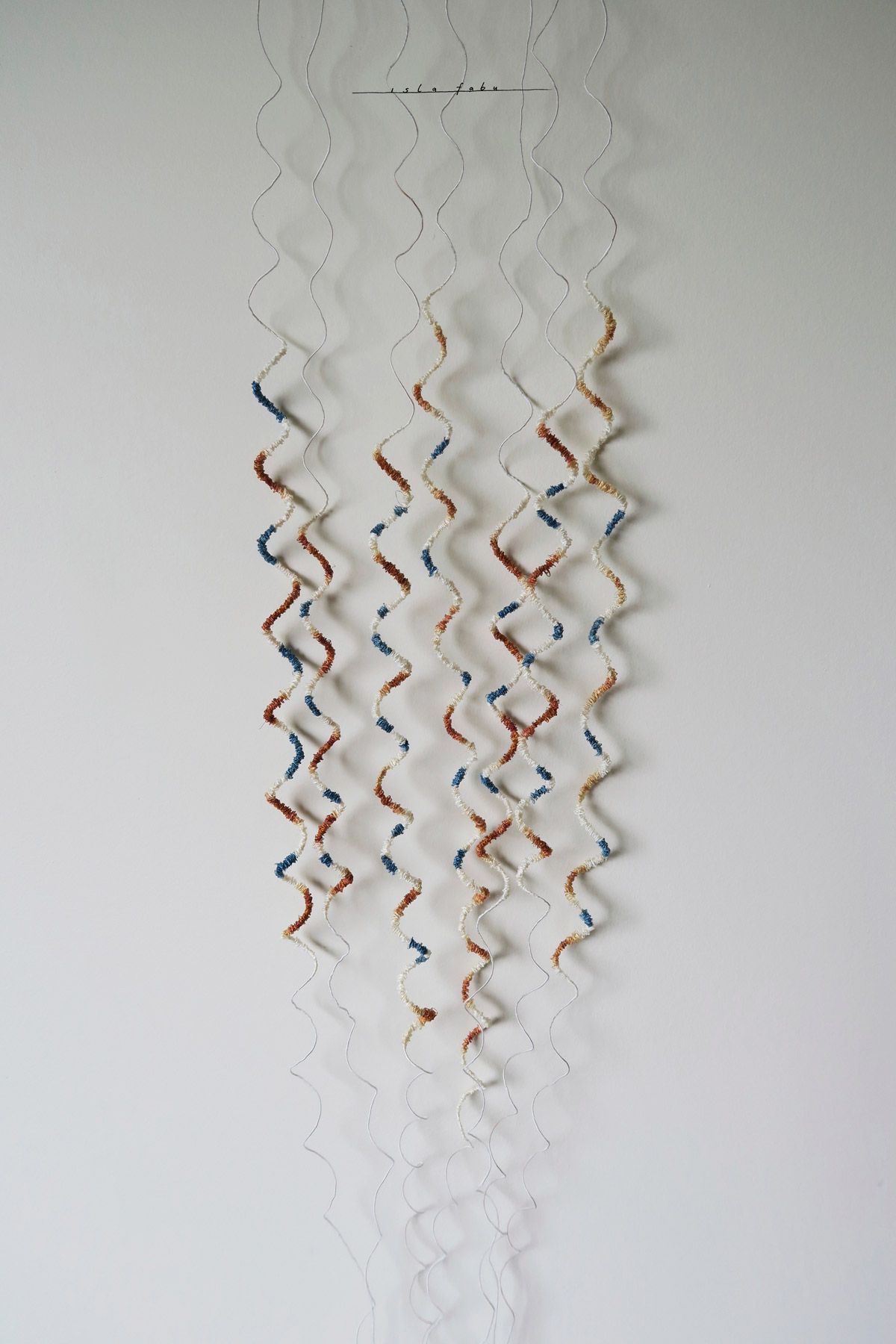 Hand spun muka (fibre of harakeke /New Zealand Flax) and silk on wire, dyed with indigo and mangrove