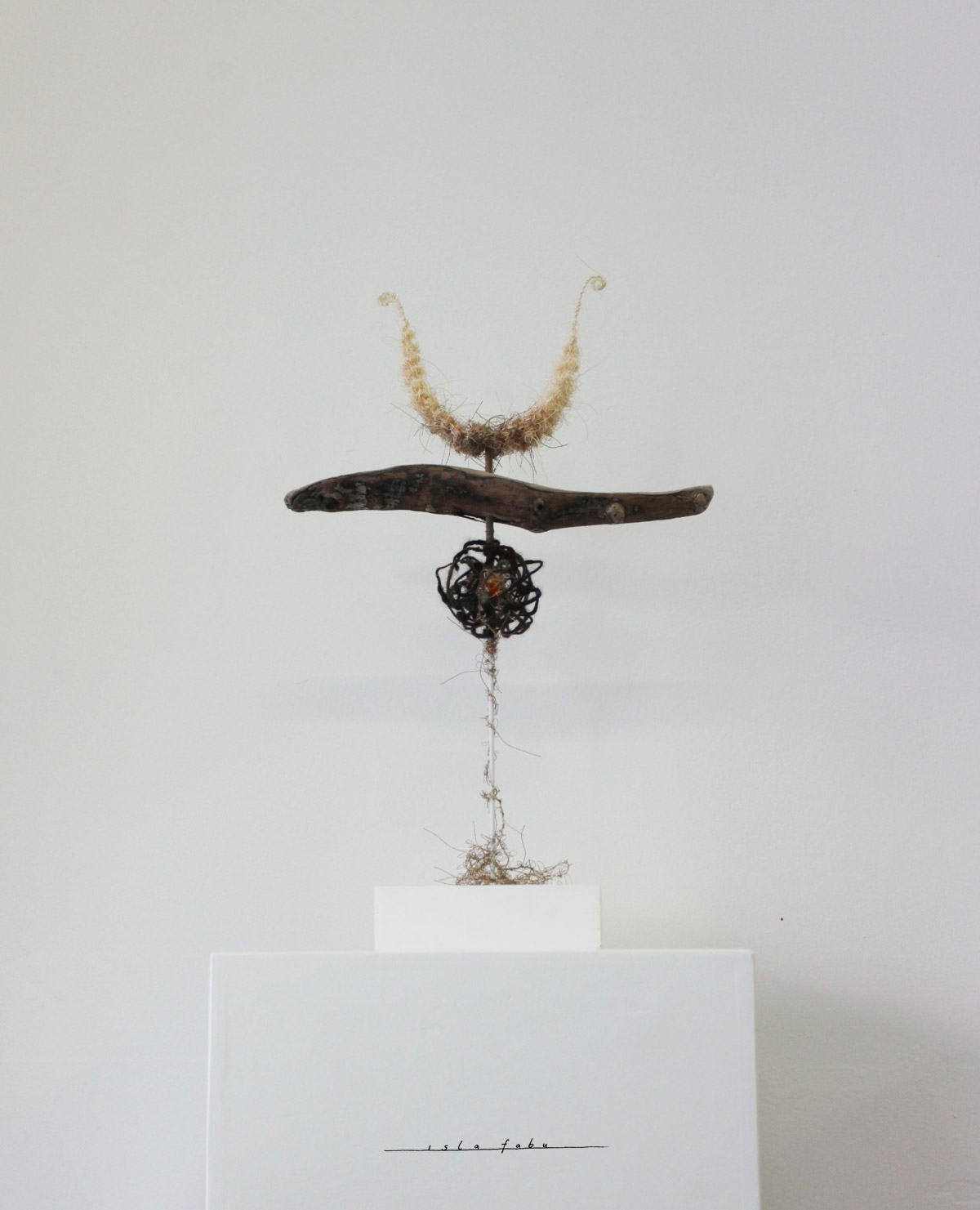 Hand spun muka (fibre from harakeke) dyed with harakeke seed pods; wool, alpaca & silk, hand spun on wire; Baltic amber; driftwood
