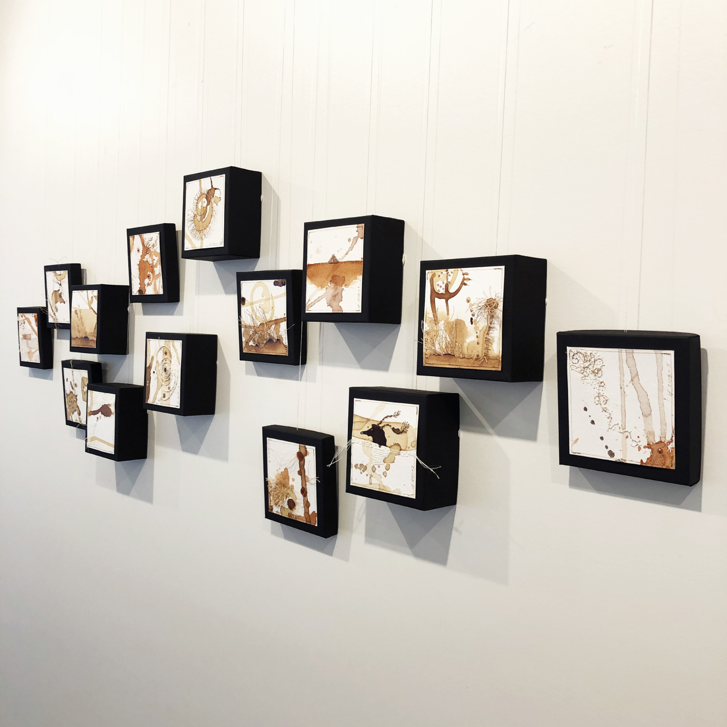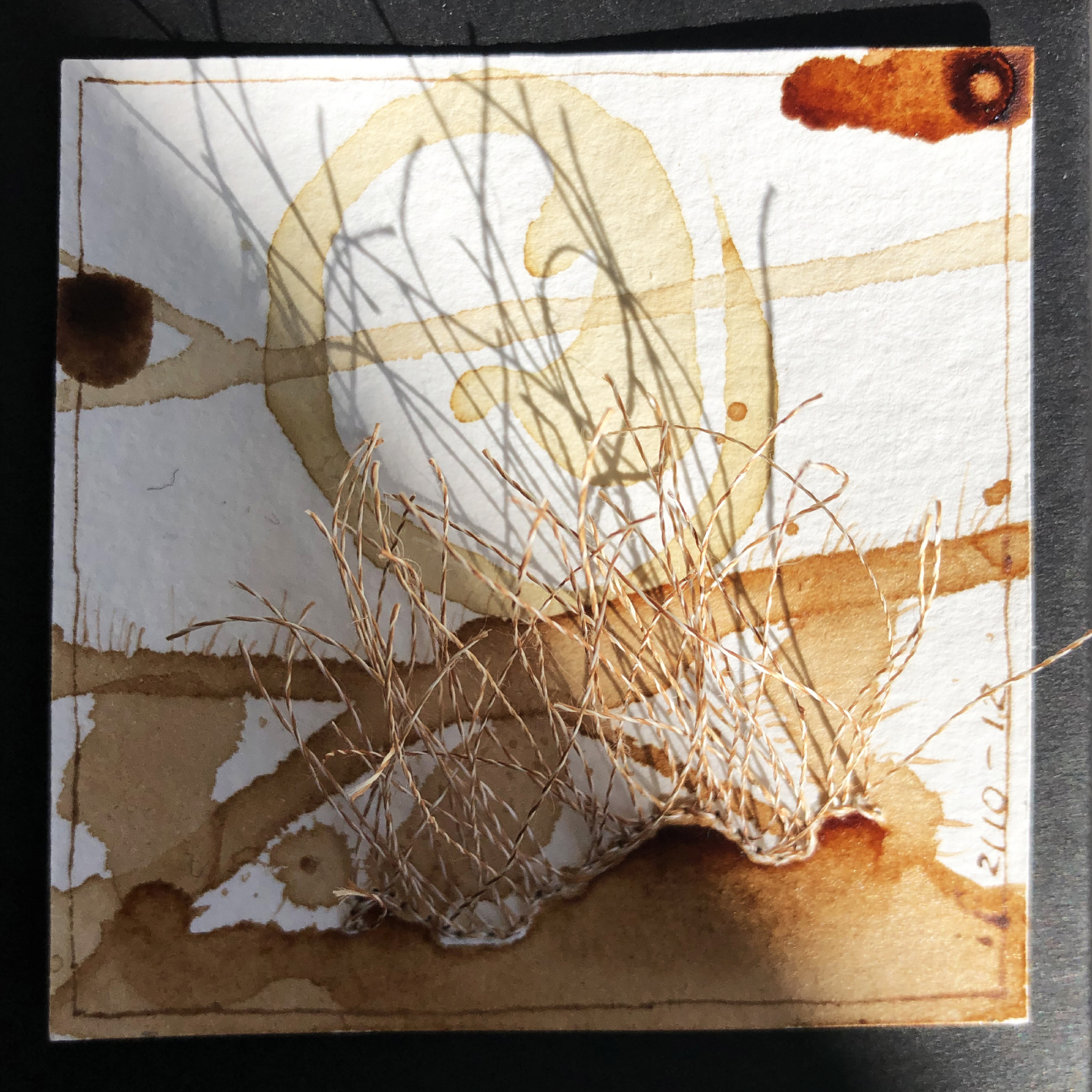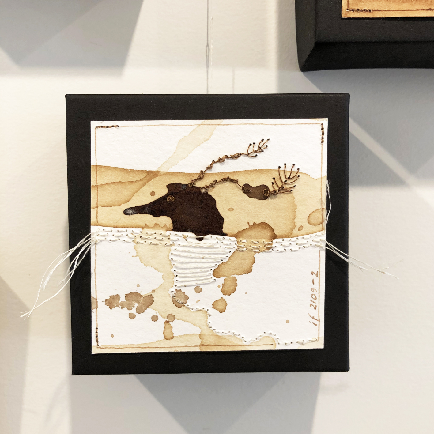 Hand made botanical watercolours, hand spun muka (partially dyed with botanical colours) hand stitched on card board boxes