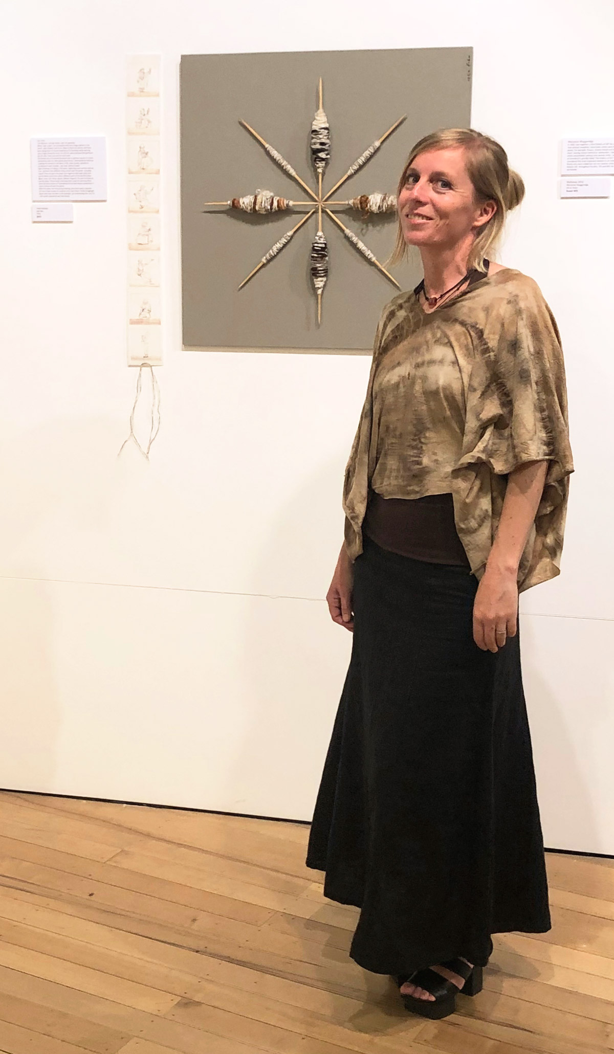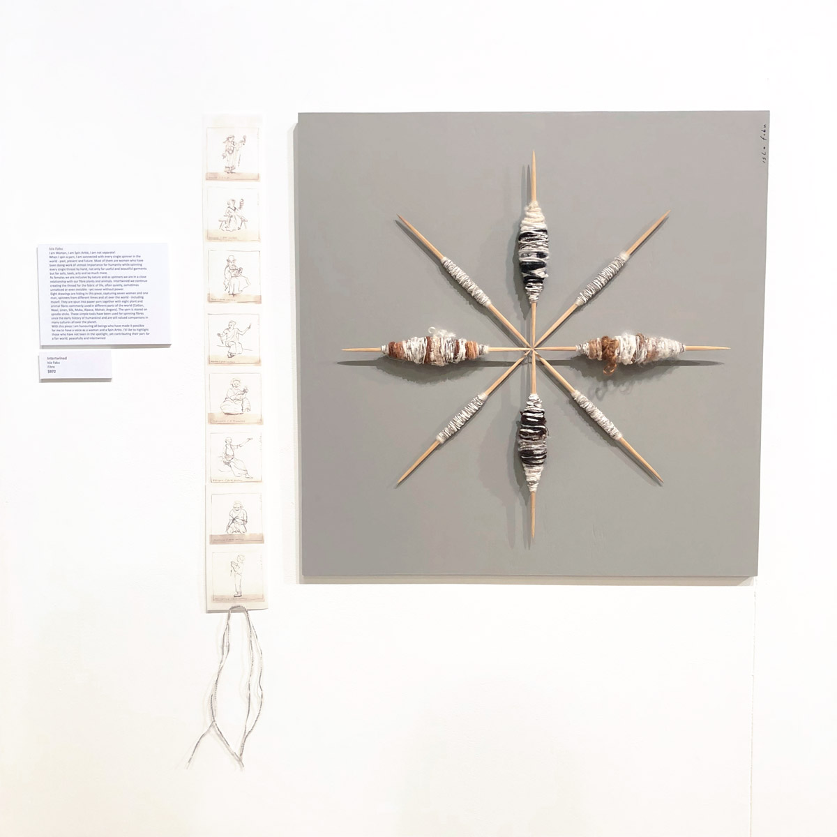 Handspun paper drawings (drawn with walnut ink); cotton, wool, linen, silk, muka, alpaca, mohair, angora - handspun on wire: spindle sticks; mounted on board