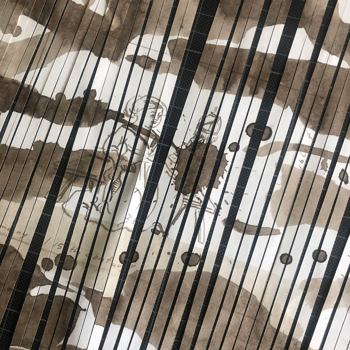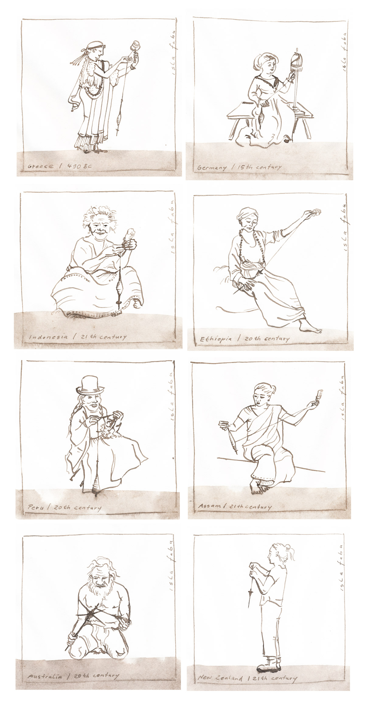 Eight drawings are hiding in this piece, capturing seven women and one man, spinners from different times and all over the world - including myself. They are spun into paper yarn together with eight plant and animal fibres commonly used in different parts of the world (Cotton, Wool, Linen, Silk, Muka, Alpaca, Mohair, Angora). The yarn is stored on spindle sticks. These simple tools have been used for spinning fibres since the early history of humankind and are still valued companions in many cultures all over the planet.